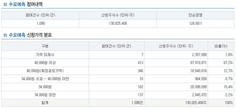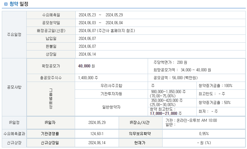 | 수요예측 결과 | - 경쟁률 124.60 대 1 - 공모가 40,000원(밴드 상단) |